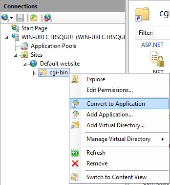 Then click "OK" and you will see that the "cgi-bin" virtual directory has been added to your IIS Web site. Now, right-click this "cgi-bin" virtual directory and click on "Convert to Application".